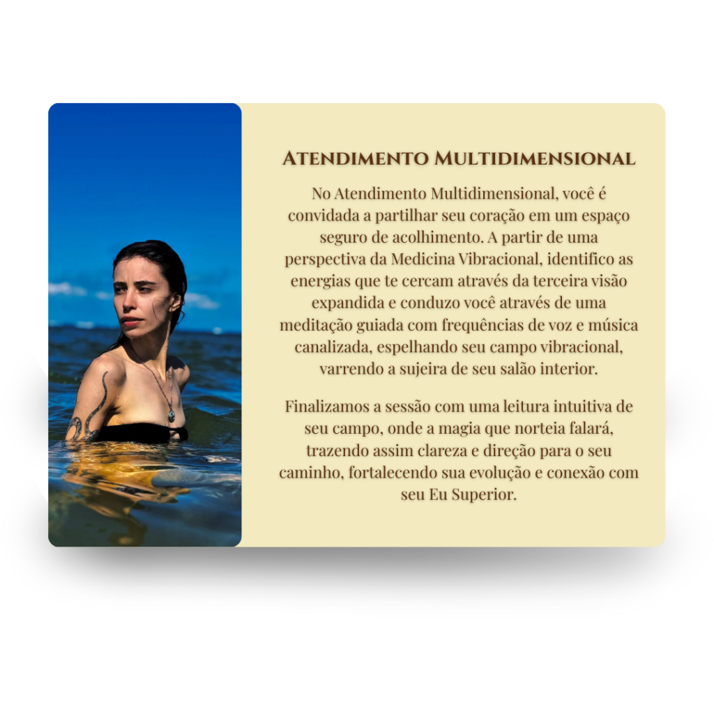 Cada encontro é um ritual único, guiado pelo Espírito do momento e pelo que sua alma precisa revelar. Dentro desse campo, você será sustentada por: